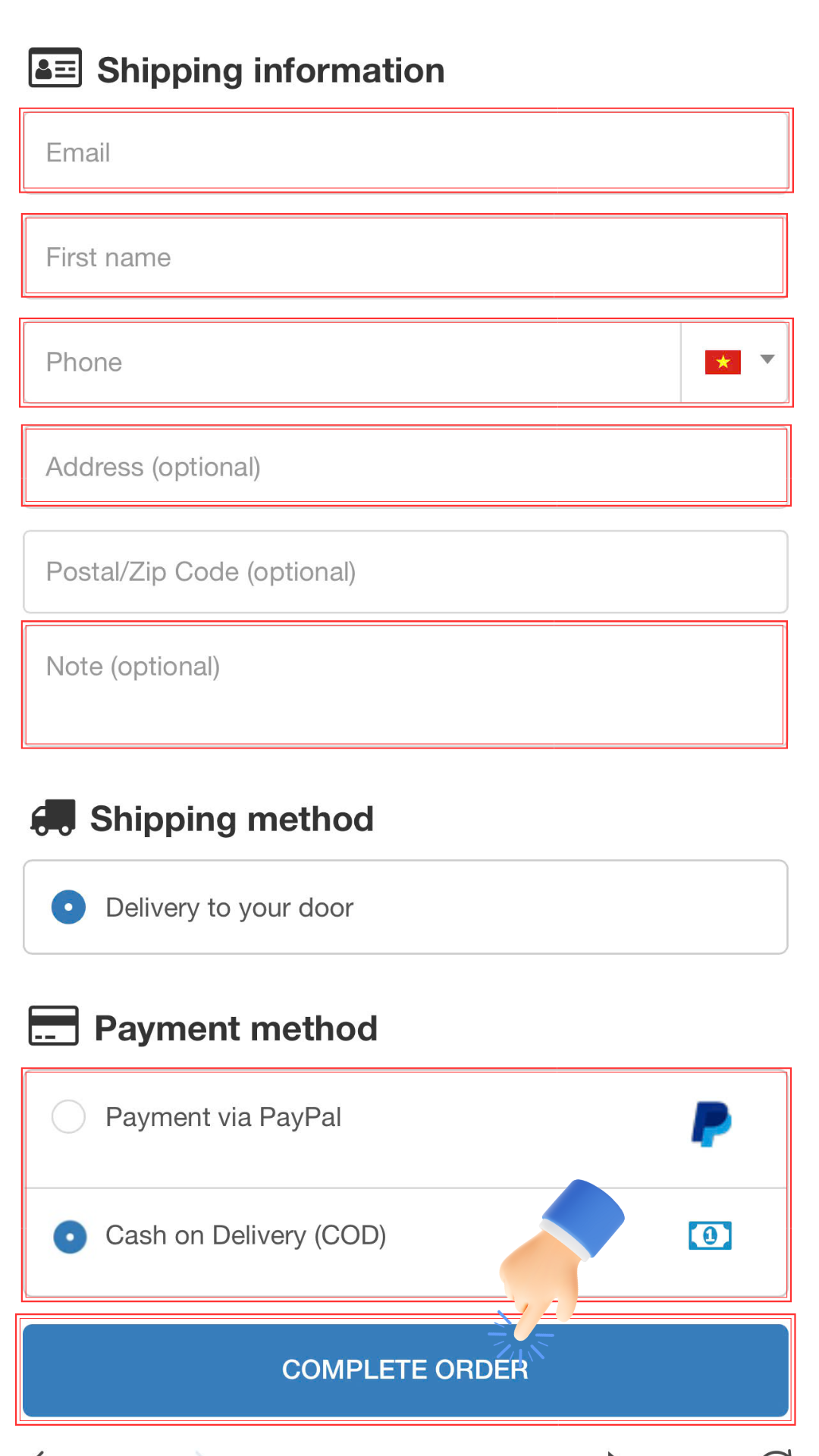 • Step 5: You just need to write correctly " FULL NAME ", " EMAIL ", " PHONE NUMBER " AND " PRODUCT RECEIPT ADDRESS "- If you need us to note anything, you can fill in " NOTE "